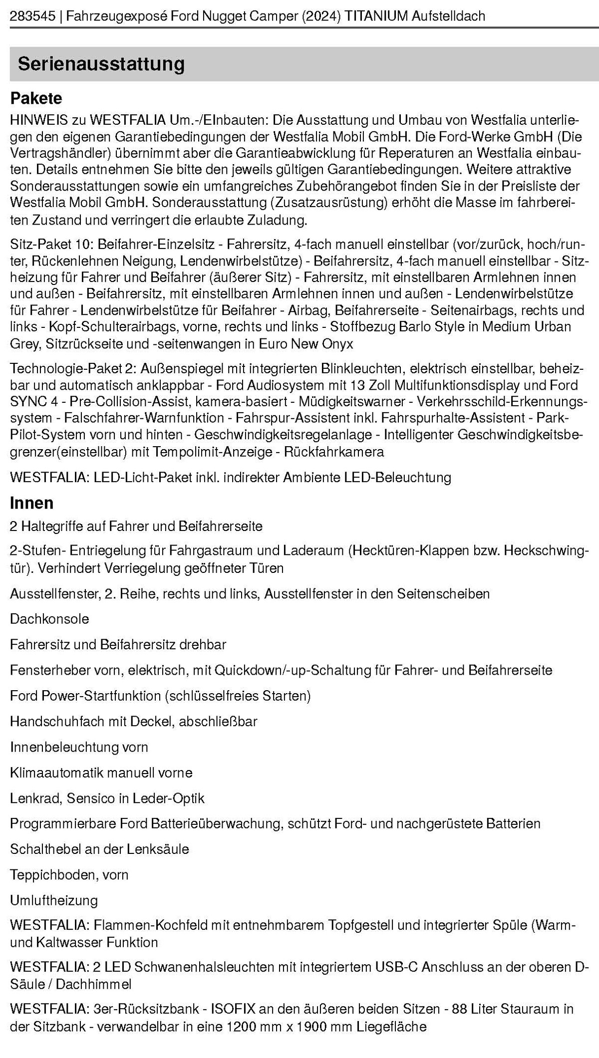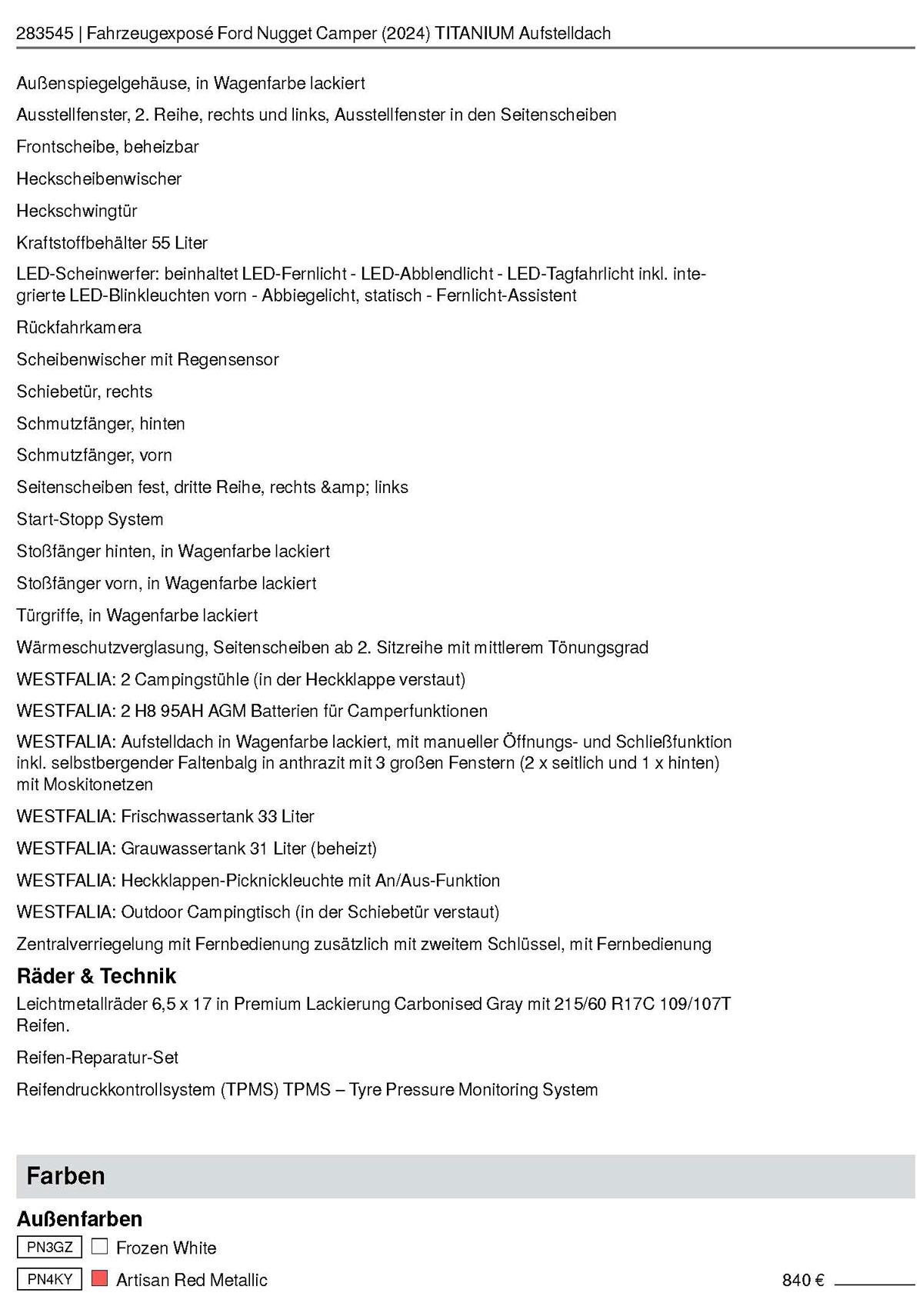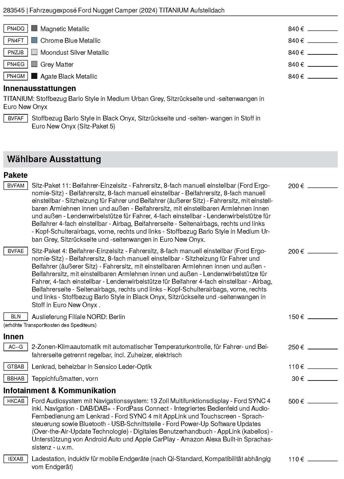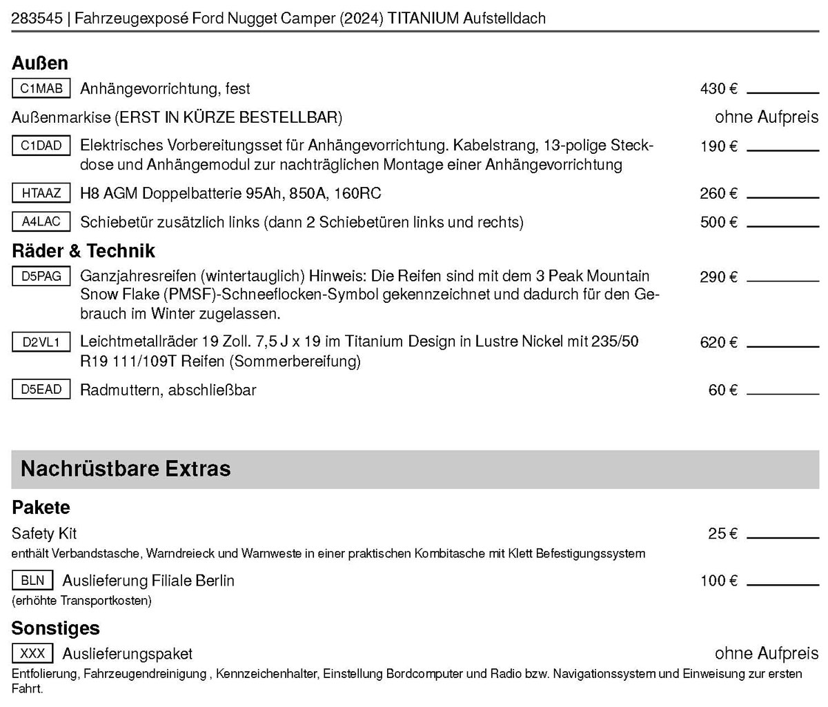 der Tabelle mit den "Optionalen Extras"